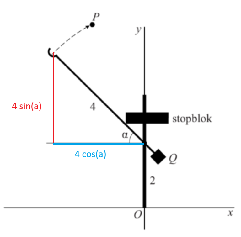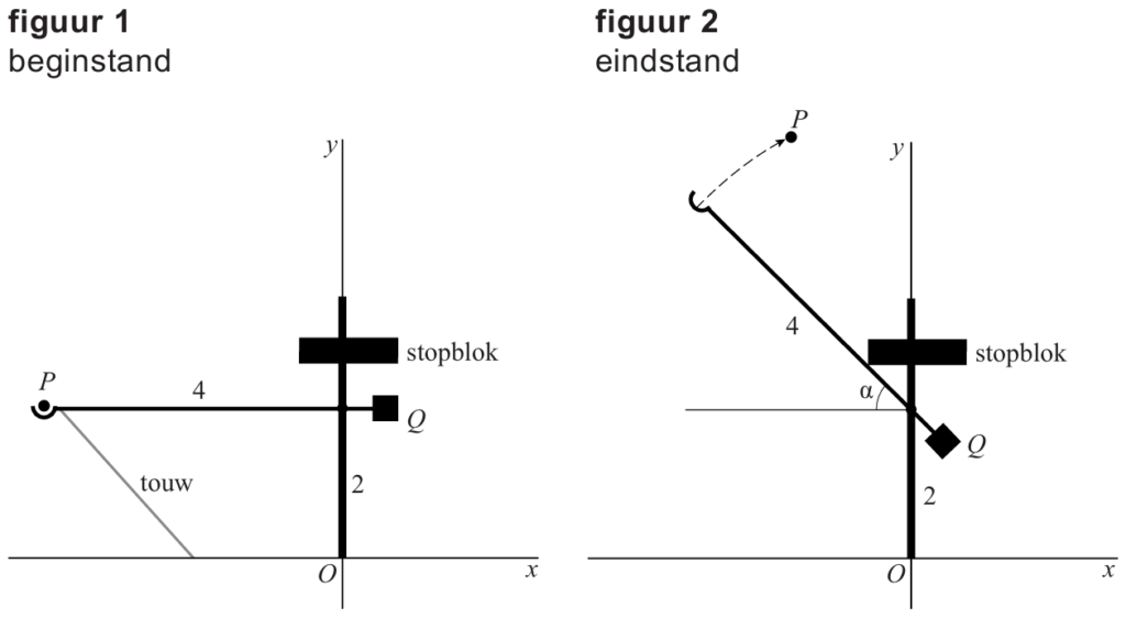 . In het begin wordt de hefboom horizontaal gehouden door een touw tussen hefboom en de grond. De hoogte van de hefboom is dan 2 meter.