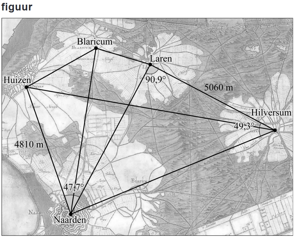 In 1723 heeft landmeter M. Walraven onderstaande kaart van het Gooi gemaakt. De hoekpunten van de driehoeken op de kaart zijn vaak de kerktorens van de dorpen. Met behulp van een hoekmeetinstrument heeft Walraven enkele hoeken zeer nauwkeurig opgemeten. Verder zijn twee hemelsbrede afstanden bepaald. Met het netwerk van driehoeken op de kaart kunnen zo de afstanden tussen de kerktorens berekend worden.